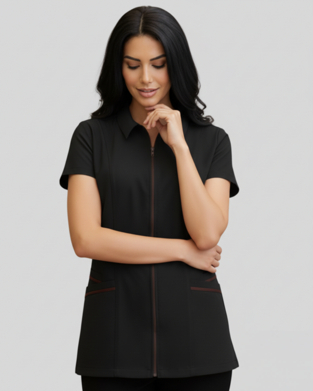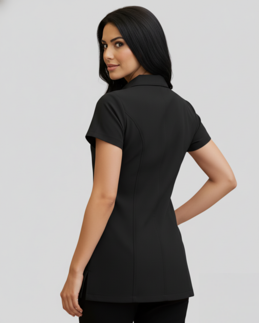 El modelo Barco combina elegancia y funcionalidad en una prenda diseñada para destacar en entornos profesionales. Su cuello corte italiano le da un toque sofisticado y estructurado, ideal para proyectar una imagen pulida. El frente con cierre facilita su colocación y añade un estilo moderno, mientras que las mangas cortas ofrecen libertad de movimiento. Las cuatro bolsas funcionales —dos externas con vivos decorativos y dos internas ocultas— brindan amplia practicidad sin sacrificar estética. Su espalda con pinzas y corte acinturado definen la silueta de manera favorecedora.